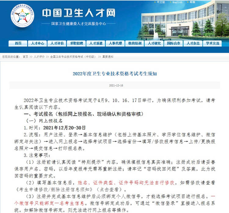 2022年度卫生资格考试报名时间:12月20日-30日