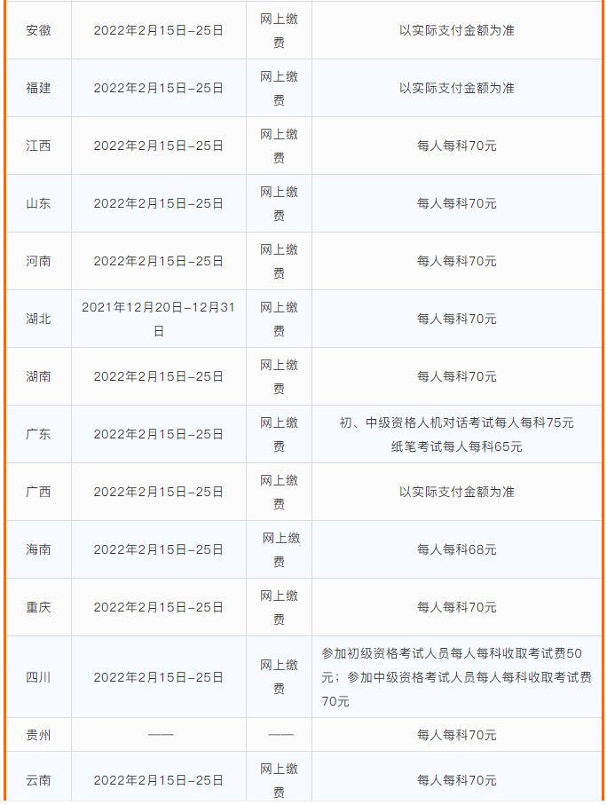北京、天津、河北、内蒙古、辽宁、吉林、黑龙江、上海、江苏、浙江、安徽、福建、江西、山东、河南、湖南、广东、广西、海南、重庆、四川、西藏、宁夏、新疆兵团考区开通了网上缴费功能。