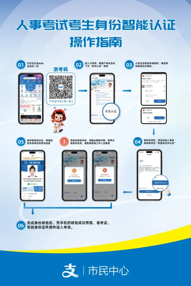 (1)考试当天,请于每科目(场次)开考前1小时到达考点, 在考点(考场)入口处使用支付宝扫一扫张贴的“浙考码”完成身份认证。