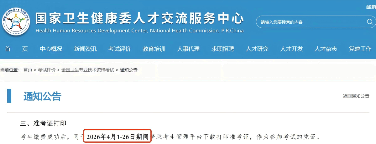 2026年卫生资格考试准考证打印时间:考生缴费成功后,可于2026年4月1-26日期间登录考生管理平台下载打印准考证,作为参加考试的凭证。