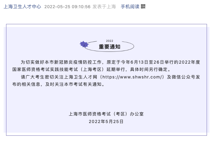 刚刚,上海发布 2022 年度国家医师资格考试实践技能考试延考通知