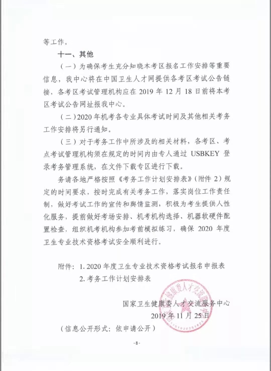 时间:2019年12月24日至2020年1月13日。考生可登录中国卫生人才网(www.21wecan.com)进行网上预报名。