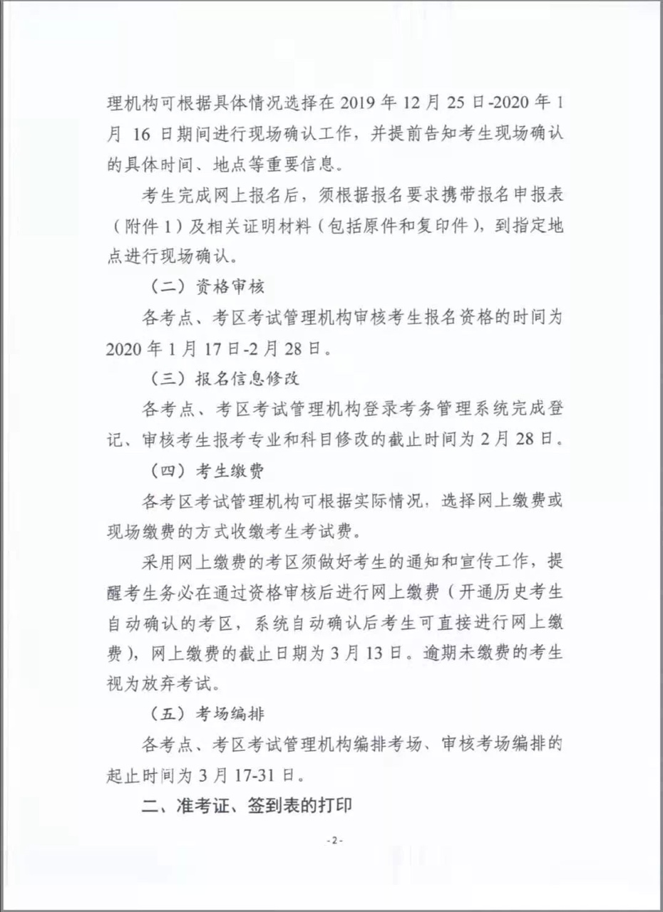 时间:2019年12月25日至2020年1月16日。考生需要携带报名申报表和相关证明资料(原件及复印件)、到各省市指定地点进行现场确认。
