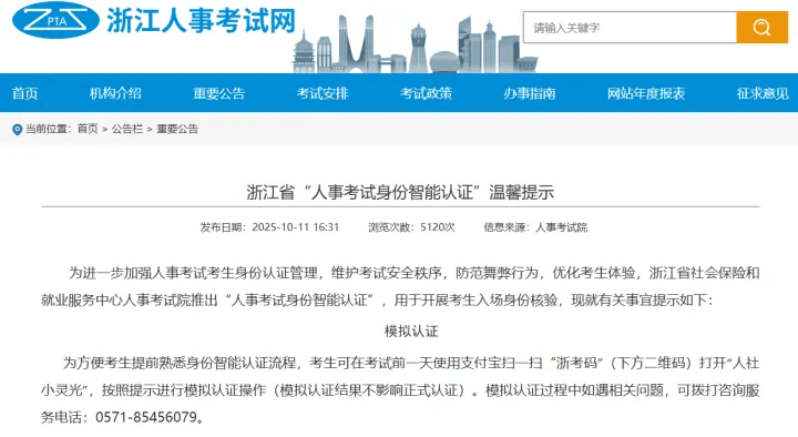 为方便考生提前熟悉身份智能认证流程, 考生可在考试前一天使用支付宝扫一扫“浙考码”(下方二维码)打开“人社小灵光”,按照提示进行模拟认证操作(模拟认证结果不影响正式认证)。模拟认证过程中如遇相关问题,可拨打咨询服务电话:0571-85456079。