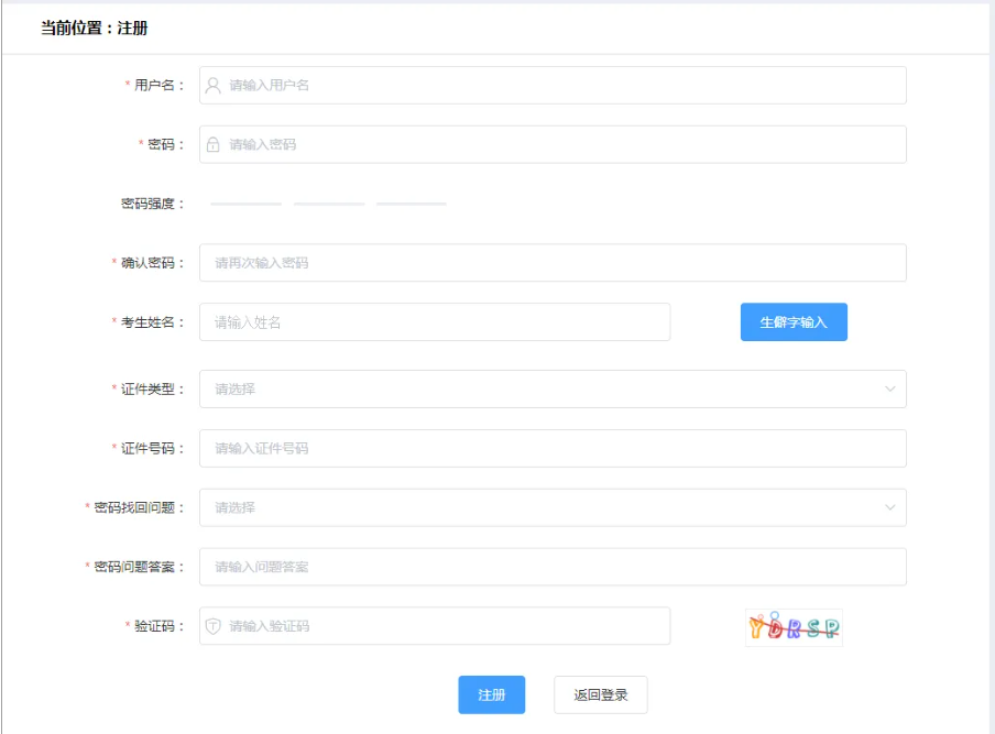5. 注册成功后系统会返回登录页面,输入注册的用户名、密码以及页面显示的验证码, 登录考生管理平台。